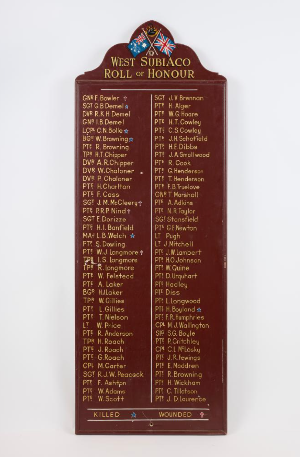 A WWI Roll of Honour is the April object of the month. This board lists 76 names of men who served in the First World War from West Subiaco, with a blue star denoting those who were killed and a red cross those who were wounded.