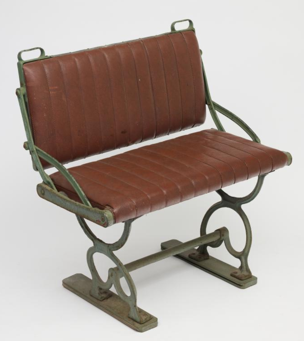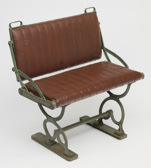 This tram seat was from the Subiaco tram which ceased operation in 1958. It's green painted metal frame and ornate legs are complimented by the brown marbled vinyl leather upholstery.