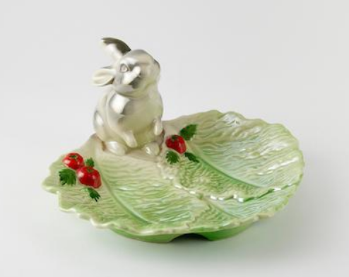 This beautiful Wembley Ware platter of green lettuce leaves, red tomotoes and a grey rabbit has been finished with a lustre glaze. This plate belonged to the Viska family of Floreat Park, and who used it on occasions.