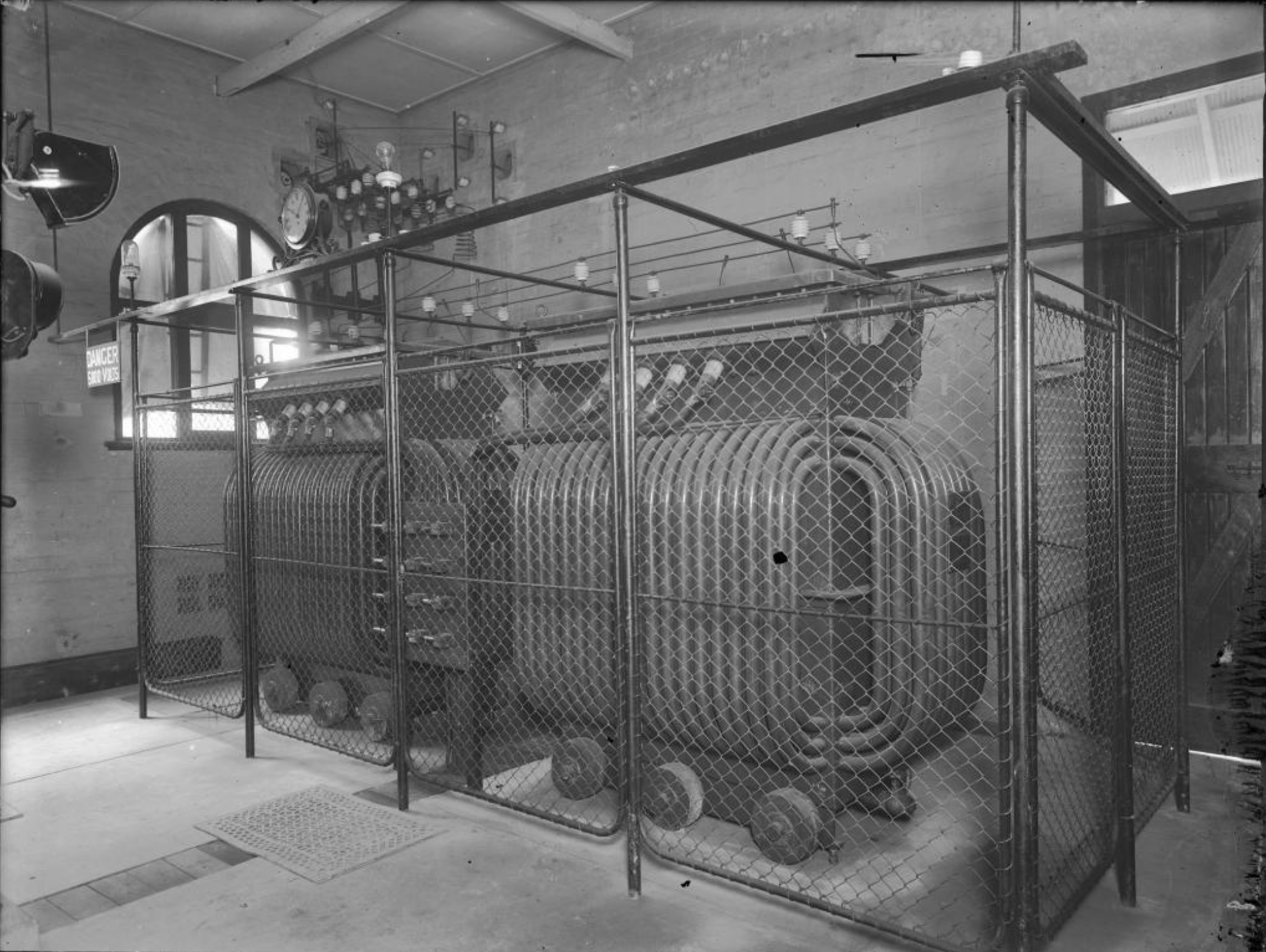 The old wooden door and arched windows of the building are still in the rear gallery and a large storefront cabinet now runs along the wall where this turbine once stood. Architectural remnants of the building’s former life can still be seen today, including three insulated power points on the front of the building and a sign that reads ‘DANGER 6000 volts’.