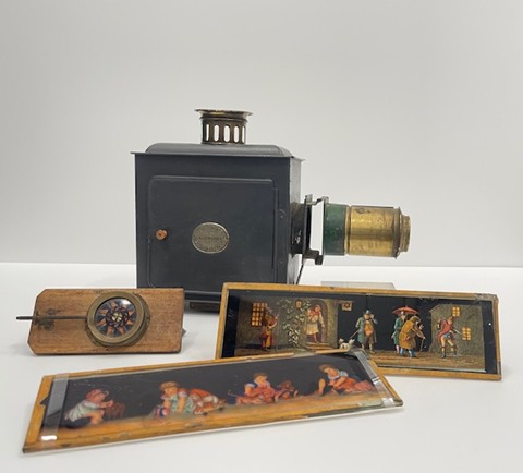 This item was used with miniature glass slides and was illuminated by a candle, paraffin or similar burner to project images onto a wall or screen.