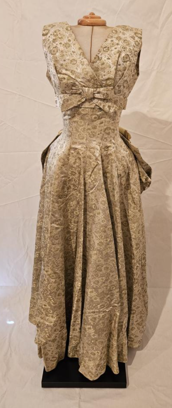 Circa 1955, this dress represents the height of fashion and would have been supported by underskirts or a crinoline to showcase the fullness of the gown and bustle.