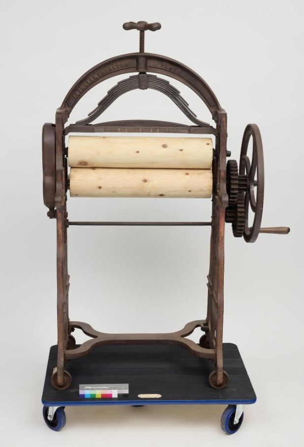 This heavy-duty iron framed beauty used for domestic laundry is known as a mangle. Cogs on one end work together when an iron wheel and handle are turned, placing heavy pressure on the wooden rollers to smooth dry linen following washing, or to wring water from wet washing.